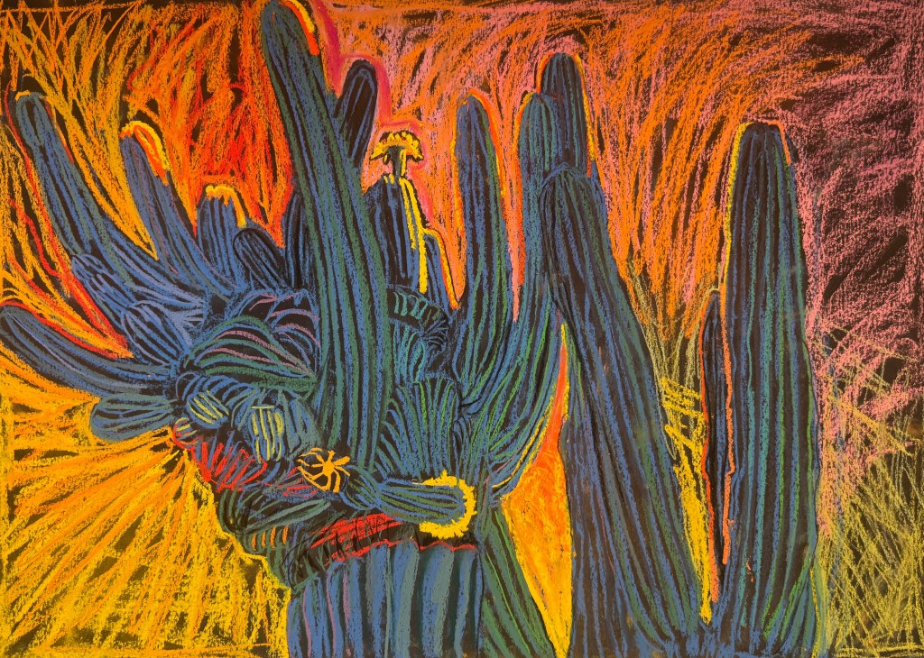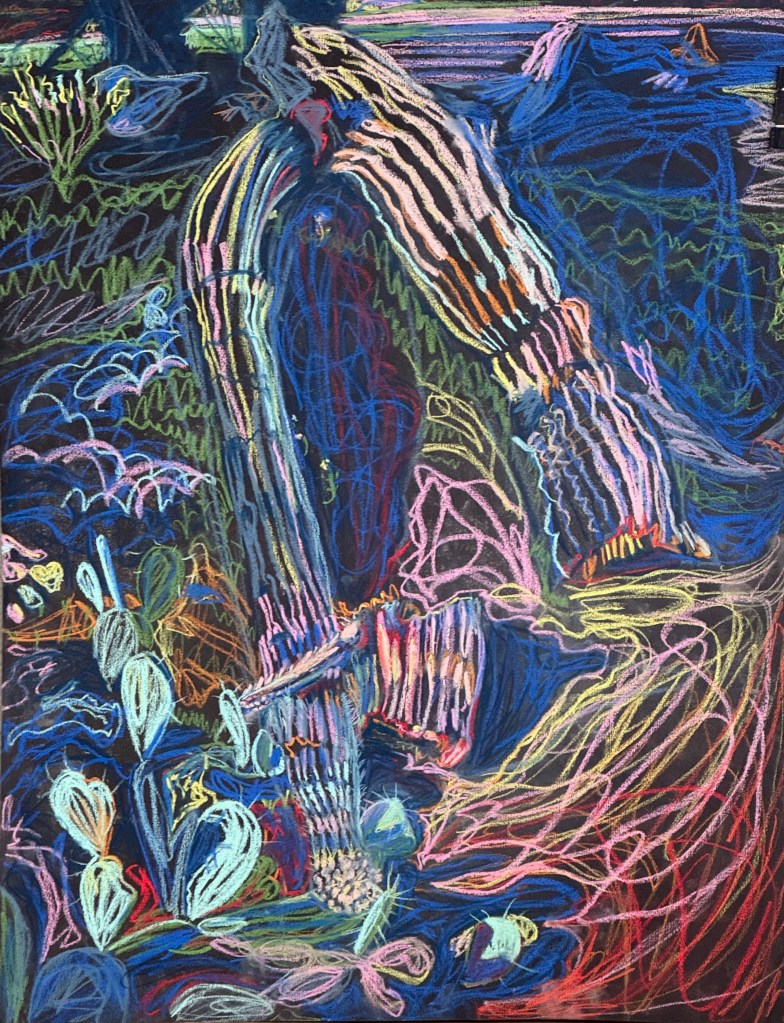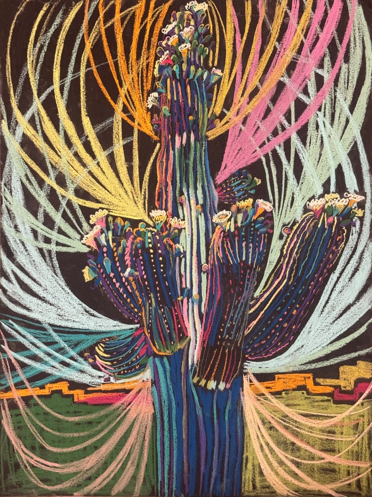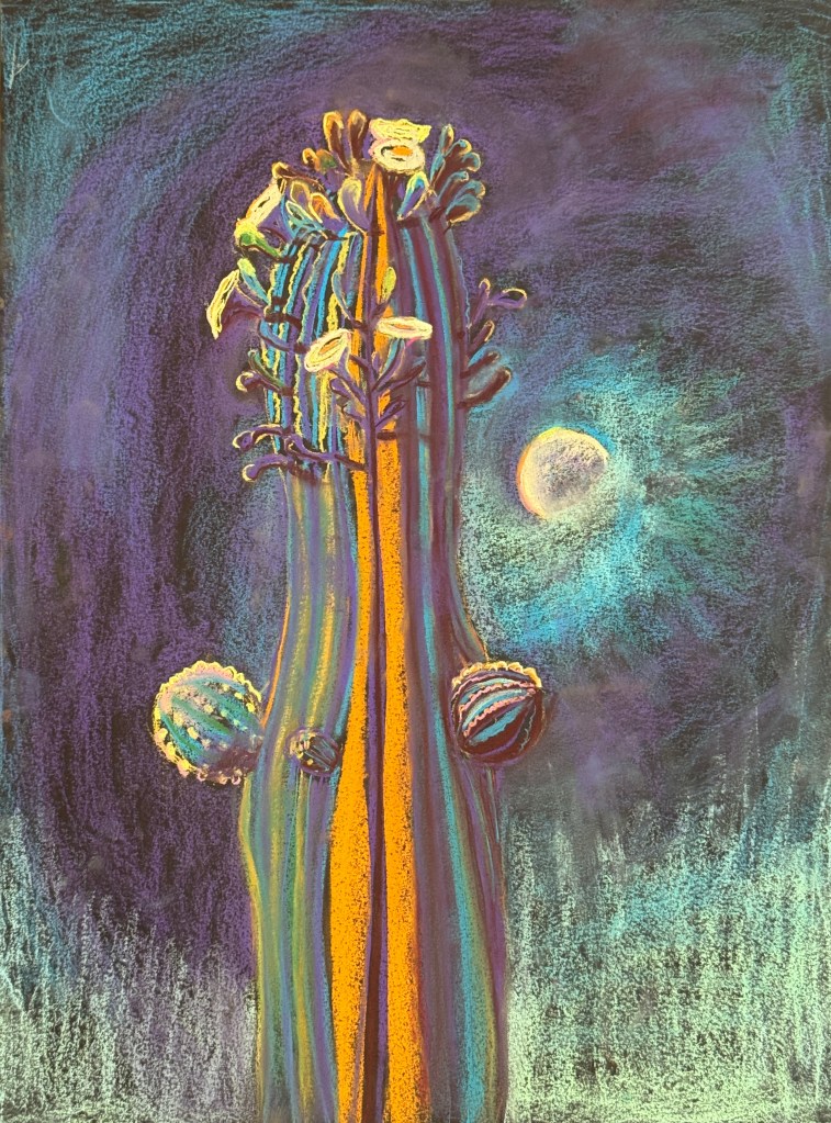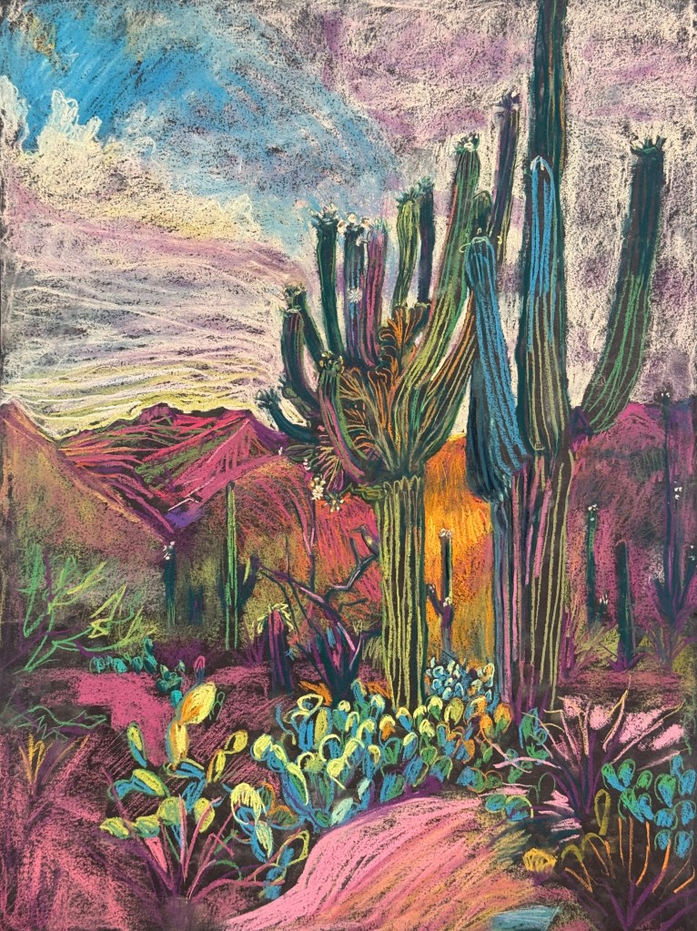 Eve Bigaj paints brilliantly colorful, emotionally intense portraits of cacti, in oil paints and pastels. Instead of an art degree, she holds a PhD in philosophy from Harvard University (her dissertation discussed the internal experience of beauty). She has painted her whole life, but she started taking her art seriously in 2015, when she first attended David Andrus’s Painting the Figure in Color class in Cambridge, MA. In 2018-19, she spent a formative year in Senegal, where her art was inspired by the country’s Sub-Saharan light and its beautiful, colorfully-clad residents. After earning her PhD in 2020, she decided academia wasn’t for her and got a coding job to support her art habit. She spent 2023-2024 working remotely, traveling across the Southwest and painting the people and landscapes she met along the way — before her love of saguaros compelled her to settle in Tucson at the start of 2025. Outside Arizona, she has exhibited in solo and group shows in Boston and Senegal. Her piece Today, Only Beauty was awarded first prize in the advanced pastel category at the Tombstone Art Gallery’s 2025 annual art show.